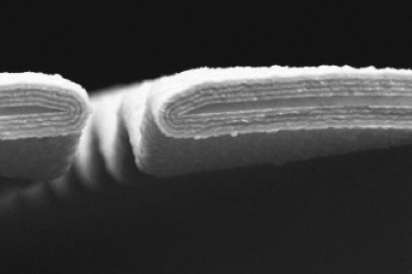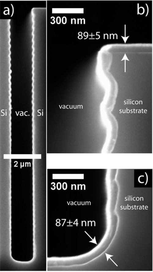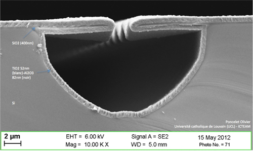 SEM cross-section of 3D cavity coated with conformal Al2O3 / TiO2 (ATO) nano-laminate ALD film. Courtesy of O. Poncelet, L. Francis, Univ. de Louvain – Deposited in Fiji® system.