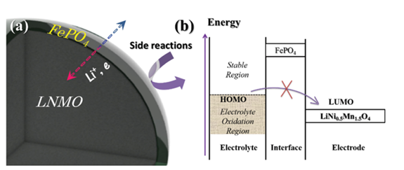 Ultrathin FePO4 as an electrochemically active barrier on LMNO particles to prevent electrolyte oxidation. Deposited in Savannah® under expo mode.