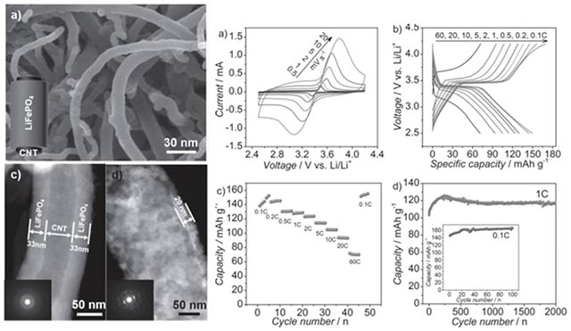 Conformal LiFePO4 cathode film deposited on carbon nanotube exhibit excellent discharge capacity and rate capability [10]