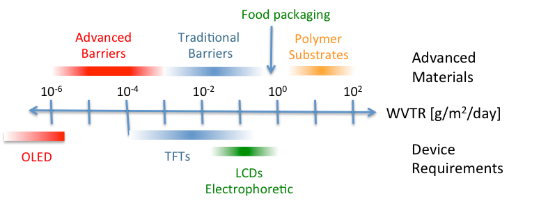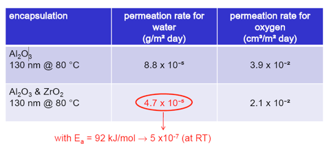 Impact of layer thickness on Water Vapor Transmission Rate (WVTR). WVTR at 3.2E-4 g/m2/day at 80˚C for 40 nm film corresponds to 8.7E-7 g/m2/day at room temperature.